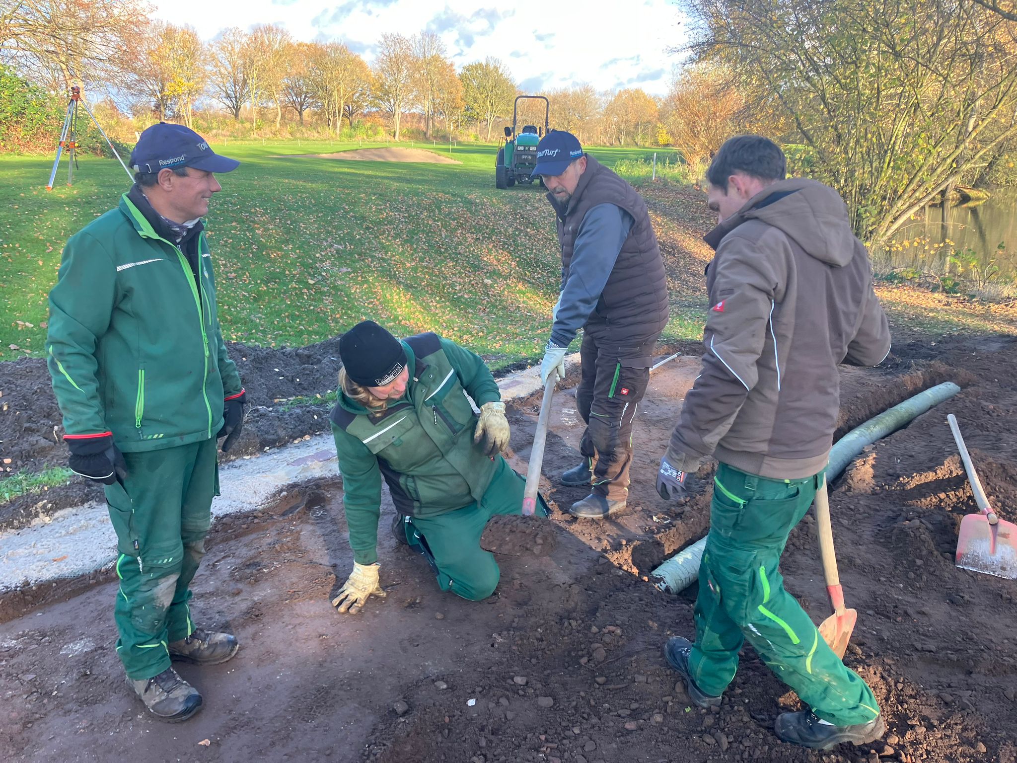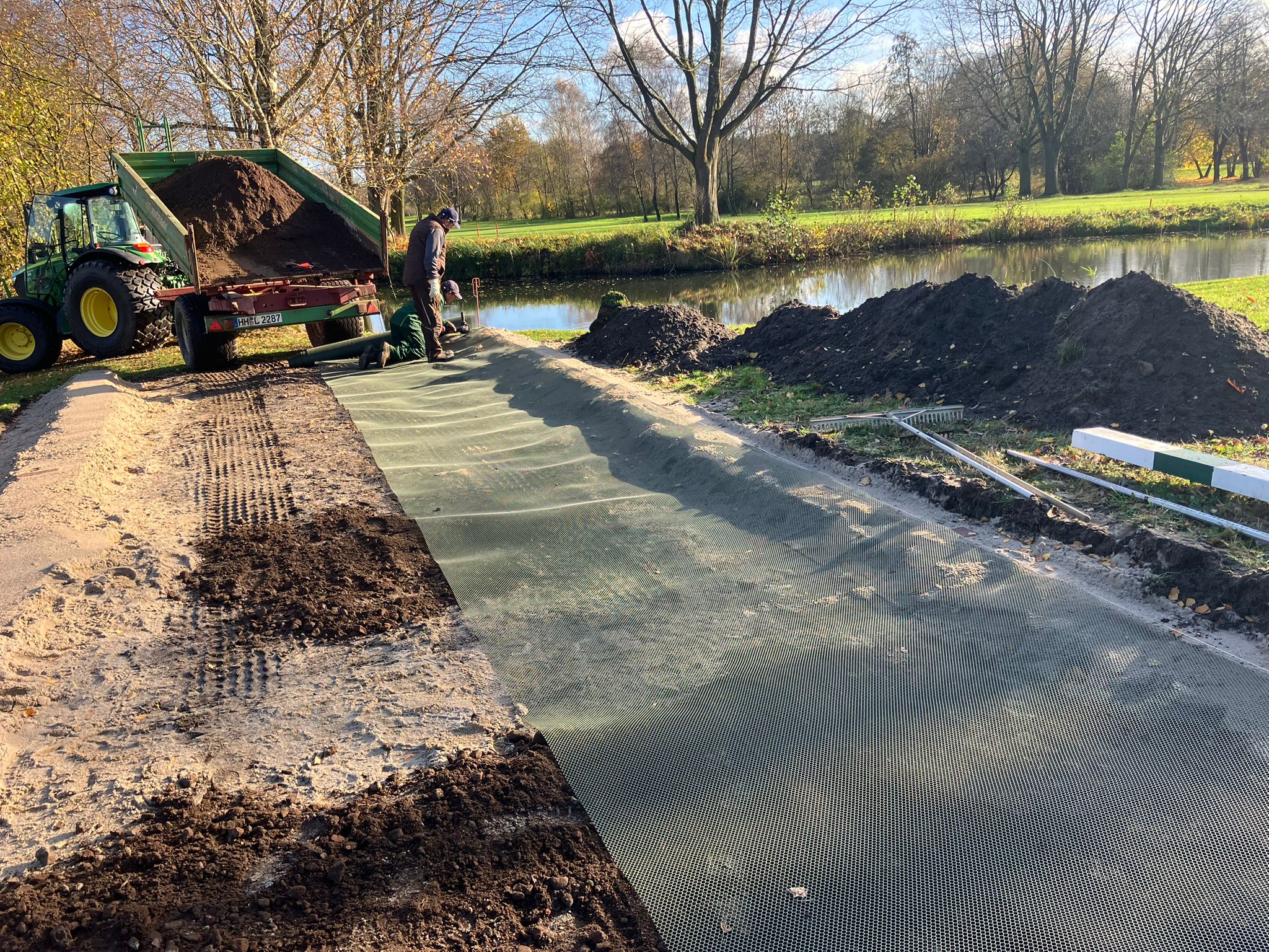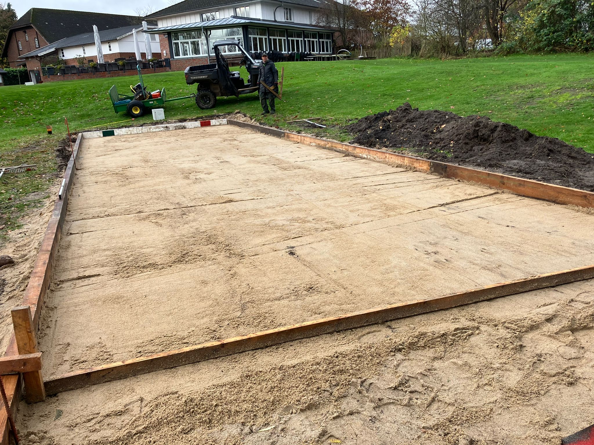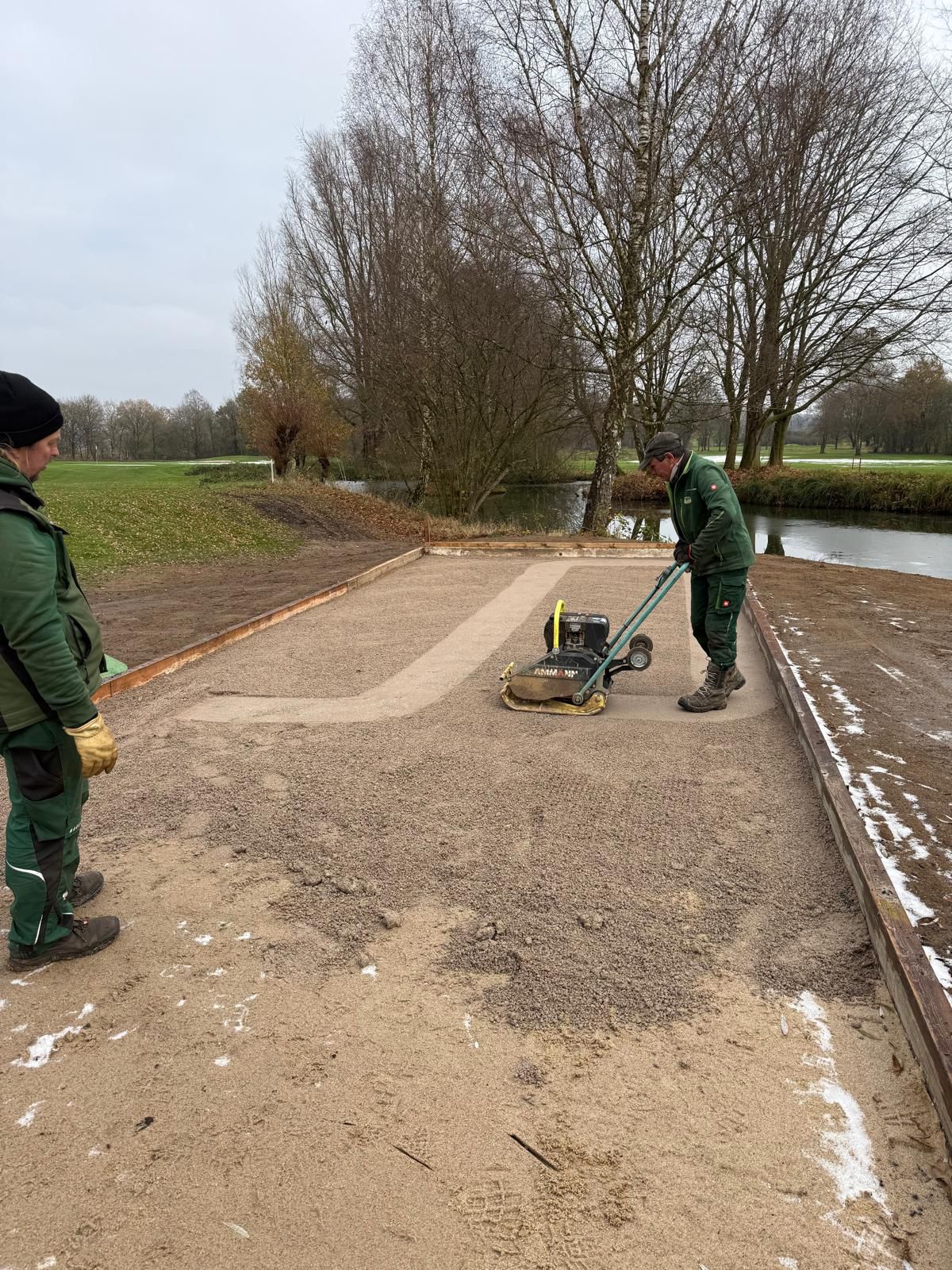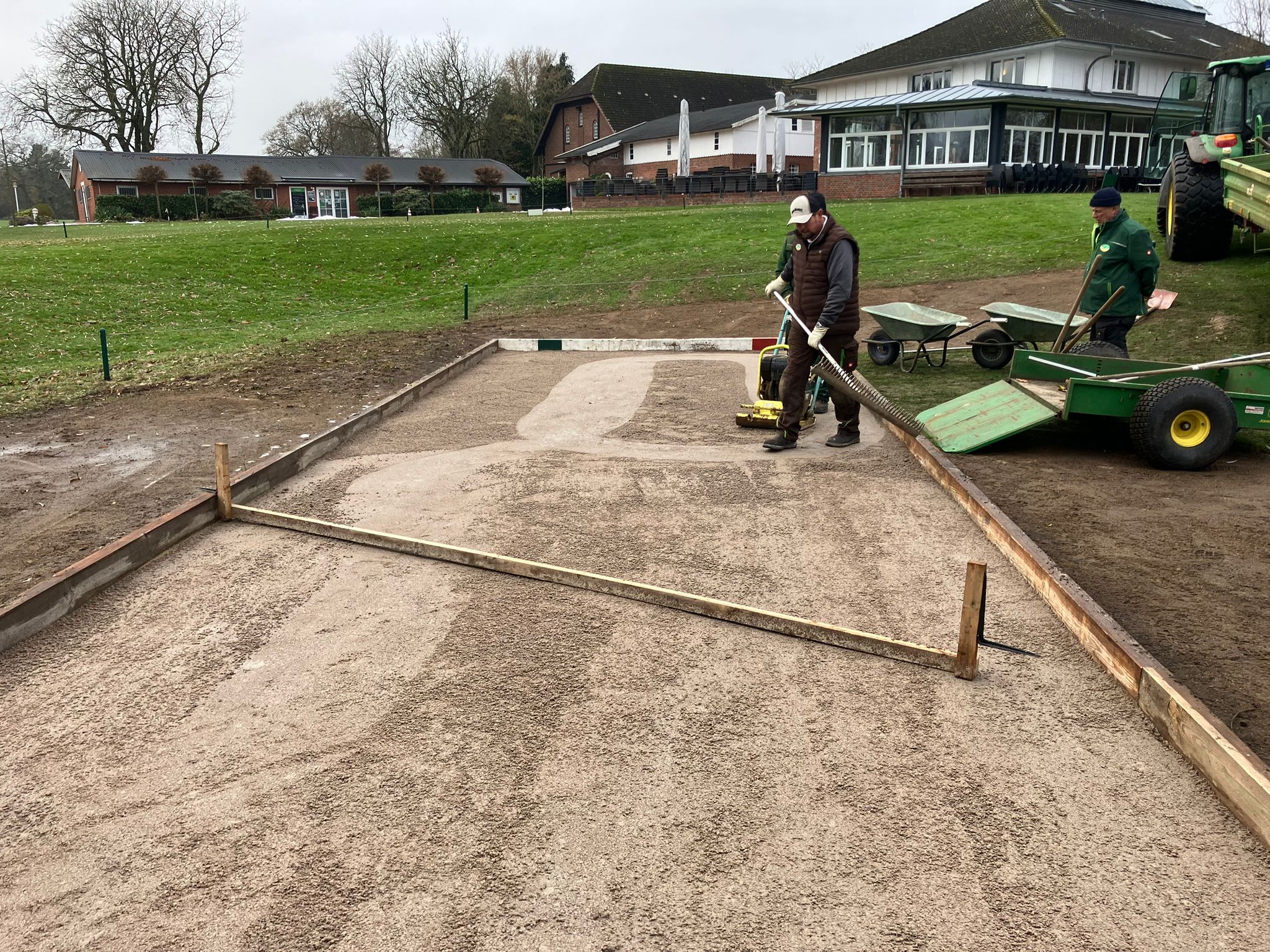 „Boule and the gang“ – das ist der vielsagende Name einer Gruppe von Golferinnen und Golfern aus unserem Club. Marie Louise Dietrich und Ihr Mann Karsten Großimmlinghaus, Britta Gedaschko und Ihr Mann Sönke, unser Haus und Hof Vorstand Frank Schultz und sein Mann André sowie Gabi Unger und ich (Matze Steiner) treffen sich seit einigen Jahren regelmäßig, um neben dem Golf gemeinsam Boule zu spielen. Mal auf der Bahn bei uns im Garten, mal auf Gedaschkos Bahn, mal auf einem öffentlichen Platz in Hasloh, mal im Lohmühlenpark. Irgendwann kam dann der Vorschlag: es wäre doch klasse, wenn wir auch bei uns im Club spielen könnten – Platz genug haben wir ja. Das Projekt war geboren. Drei Voraussetzungen wurden definiert: Der Platz muss offen für alle sein, der Bau darf den Club kein Geld kosten und unser Headgreenkeeper Jörn Startmann muss es gutheißen. Jörn gab nicht nur begeistert seine Zustimmung, er plante auch sofort den Bau. Klar war allerdings, dass das Projekt nur außerhalb der Saison realisiert werden könnte, da die Greenkeeper im Sommer wahrhaft andere Aufgaben haben. Das Holz für die Bande des Bouleplatzes schenkte uns der Bürochef des Expeditionsleiters Arved Fuchs aus Bad Bramstedt. Rolf Dieter Fröhling hatte noch alte Balken in einer Halle liegen. Mitte November – nach Ende der Golfsaison 2025 - ging es dann Schlag auf Schlag. Eine Fläche links neben dem Puttinggreen wurde ausgekoffert, eine Tragschicht aus Schotter-Resten vom Betriebshof neben Abschlag B9 eingebaut und das Ganze mit dem Beachvolleyball-Sand, den uns Frank Ehrich geschenkt hatte, abgedeckt. Aus den alten Balken entstand die Bande und nach dem ersten Schnee wurde eine Deckschicht aus Wegekies installiert (finanziert von „Boule and the Gang“). Nun ist der Platz fertig und wartet darauf, in der nächsten Saison bespielt zu werden – natürlich kostenlos. Als Entspannung nach der Golfrunde oder einfach mal als gemeinsame Aktivität mit einem guten Getränk von Pierro. Boule ist übrigens einfach zu lernen ! Wer den Platz benutzt hat, zieht ihn danach mit der Rückseite der Harke wieder glatt. Das ist alles. Ein Hinweis noch für alle: Der Bouleplatz ist KEIN Übungsbunker und auch nicht zum Chippen aufs Puttinggreen gedacht !