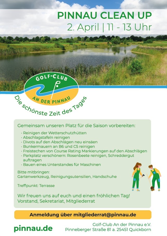 Wenn ihr beim PINNAU CLEAN UP mitmachen möchtet, meldet euch bitte unter mitgliederrat@pinnau.de oder über die PC Caddie App unter Turnierkalender an. Natürlich geht auch spontanes Mitmachen!