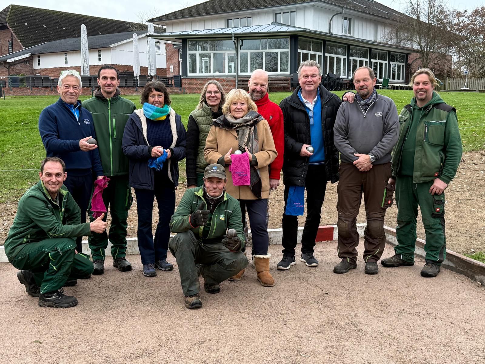 „Boule and the gang“ – das ist der vielsagende Name einer Gruppe von Golferinnen und Golfern aus unserem Club. Marie Louise Dietrich und Ihr Mann Karsten Großimmlinghaus, Britta Gedaschko und Ihr Mann Sönke, unser Haus und Hof Vorstand Frank Schultz und sein Mann André sowie Gabi Unger und ich (Matze Steiner) treffen sich seit einigen Jahren regelmäßig, um neben dem Golf gemeinsam Boule zu spielen. Mal auf der Bahn bei uns im Garten, mal auf Gedaschkos Bahn, mal auf einem öffentlichen Platz in Hasloh, mal im Lohmühlenpark. Irgendwann kam dann der Vorschlag: es wäre doch klasse, wenn wir auch bei uns im Club spielen könnten – Platz genug haben wir ja. Das Projekt war geboren. Drei Voraussetzungen wurden definiert: Der Platz muss offen für alle sein, der Bau darf den Club kein Geld kosten und unser Headgreenkeeper Jörn Startmann muss es gutheißen. Jörn gab nicht nur begeistert seine Zustimmung, er plante auch sofort den Bau. Klar war allerdings, dass das Projekt nur außerhalb der Saison realisiert werden könnte, da die Greenkeeper im Sommer wahrhaft andere Aufgaben haben. Das Holz für die Bande des Bouleplatzes schenkte uns der Bürochef des Expeditionsleiters Arved Fuchs aus Bad Bramstedt. Rolf Dieter Fröhling hatte noch alte Balken in einer Halle liegen. Mitte November – nach Ende der Golfsaison 2025 - ging es dann Schlag auf Schlag. Eine Fläche links neben dem Puttinggreen wurde ausgekoffert, eine Tragschicht aus Schotter-Resten vom Betriebshof neben Abschlag B9 eingebaut und das Ganze mit dem Beachvolleyball-Sand, den uns Frank Ehrich geschenkt hatte, abgedeckt. Aus den alten Balken entstand die Bande und nach dem ersten Schnee wurde eine Deckschicht aus Wegekies installiert (finanziert von „Boule and the Gang“). Nun ist der Platz fertig und wartet darauf, in der nächsten Saison bespielt zu werden – natürlich kostenlos. Als Entspannung nach der Golfrunde oder einfach mal als gemeinsame Aktivität mit einem guten Getränk von Pierro. Boule ist übrigens einfach zu lernen ! Wer den Platz benutzt hat, zieht ihn danach mit der Rückseite der Harke wieder glatt. Das ist alles. Ein Hinweis noch für alle: Der Bouleplatz ist KEIN Übungsbunker und auch nicht zum Chippen aufs Puttinggreen gedacht !