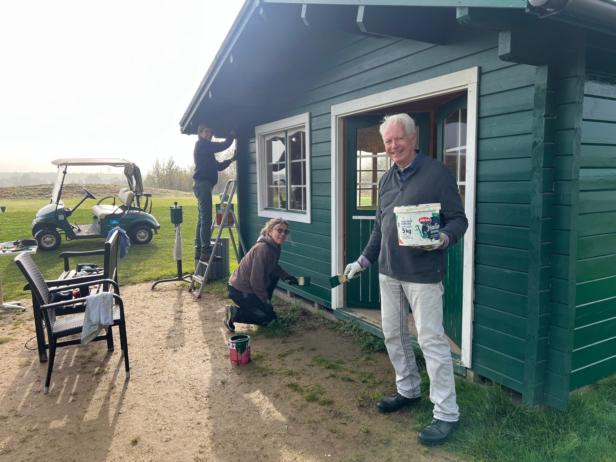 Beim Beginn der Arbeiten war es noch recht neblig und insbesondere an den Hütten auf dem C-Kurs der Untergrund sehr feucht. Das wurde aber stetig besser und am Ende konnten wir alle nach getaner Arbeit auf der Terrasse in der Sonne sitzen und darüber fachsimpeln, wie die Aufgaben bewältigt wurden.