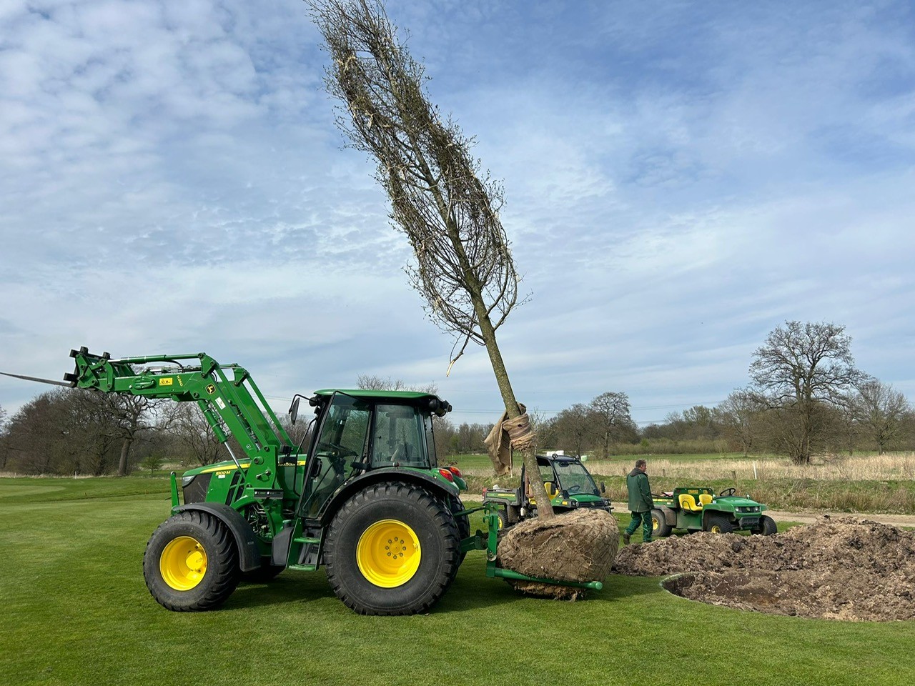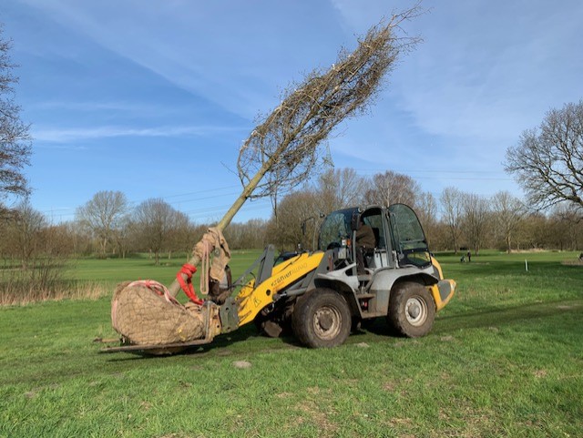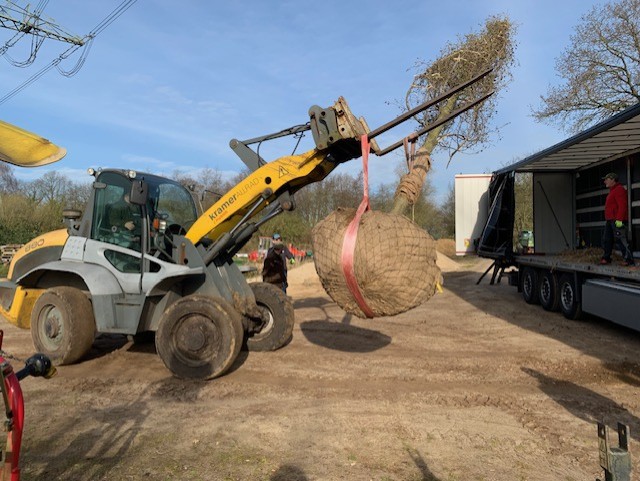 Wie die Bilder vom Abladen, Transport und Einpflanzen zeigen, hatte unser Team vom Greenkeeping bereits einiges damit zu tun, unsere neue Purpur-Erle an den geplanten Standort zu bringen.